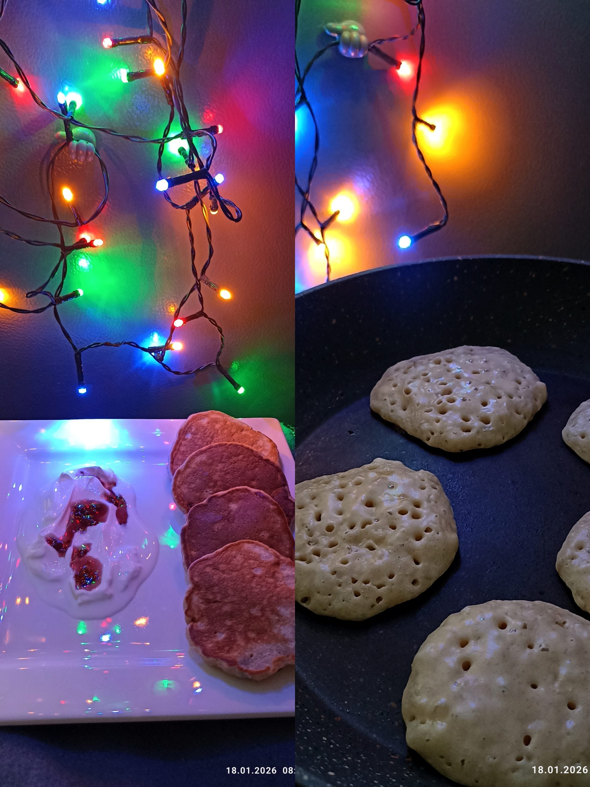 Розігрійте пательню на маленькій температурі. Викладайте невелику кількість тіста на суху сковороду, десь по 1 ст. л. Коли перший бік підрум'яниться, а зверху з'являться дрібні бульбашки — перевертайте на інший бік і смажте ще хвилину до рум'яності.
