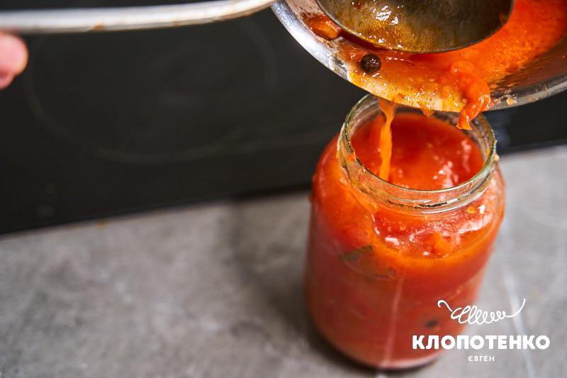 Перелийте томатне пюре в каструлю, влийте 400 мл соняшникової олії та додайте по 4 ст. л. солі та цукру. Перемішайте та доведіть до кипіння на середньому вогні. Тим часом стерилізуйте банки та кришки.