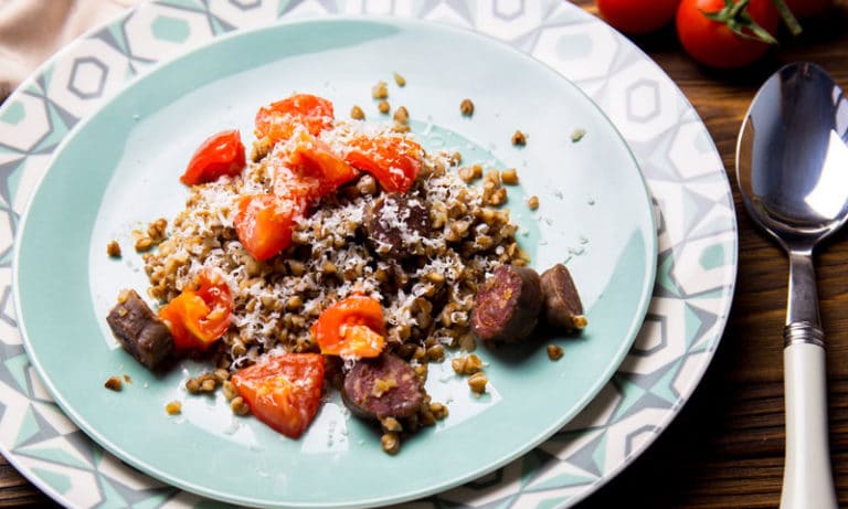ГарніриЦе щось нове! Гречка у зеленому чаї з ковбасками та томатами від Євгена Клопотенка