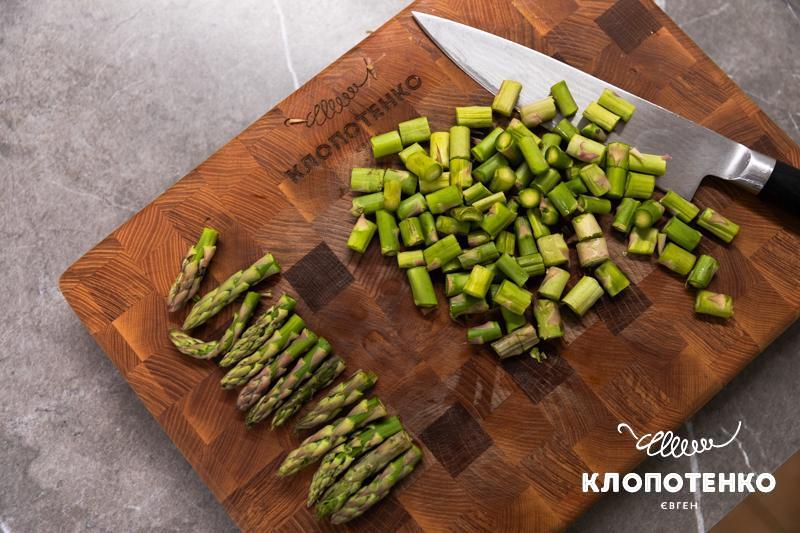 Увімкніть духовку розігріватися до 180 градусів. Вимийте 300 г спаржі, зріжте 2 см стебла знизу, наріжте решту на шматочки по 2 см. Відкладіть стебла окремо, а красиві верхівки окремо для прикраси.