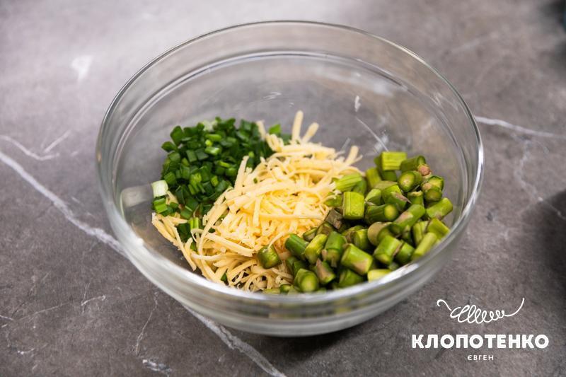Натріть на крупну тертку 100 г сиру. Змішайте в мисці стебла спаржі, цибулю та сир.