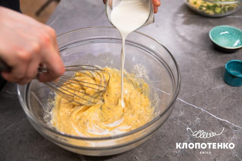 Влийте в яєчну суміш 120 мл молока та 120 мл вершків, додайте 1 ч.л. гірчиці в зернах, ½ ч.л. солі, ½ ч.л. розпушувача та ½ ч.л. орегано. Ретельно перемішайте.