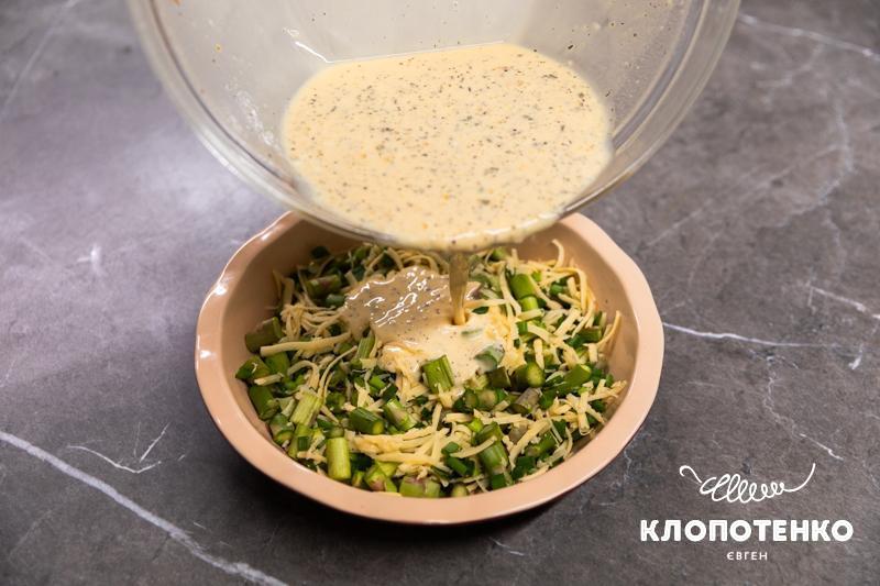 Зверху акуратно викладіть верхівки спаржі, щоб вони були на поверхні пирога. Випікайте його 40 хвилин.