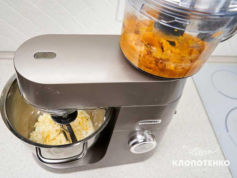 Перебийте гарбуз до однорідного стану. У цей час перебийте насадкою К чи гак 350 г сиру з 100 г цукру, 1 ч. л. кориці, 2 ст. л. кукурудзяного крохмалю і 2 яйцями.