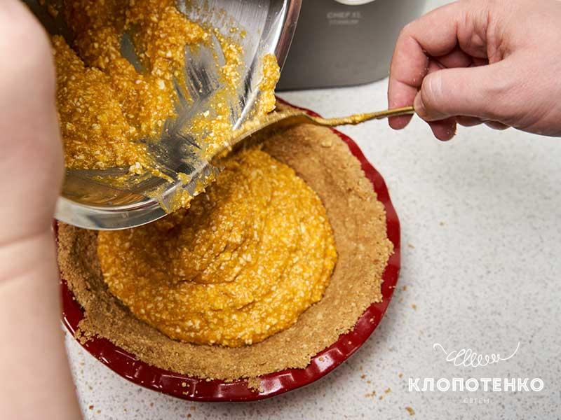 Викладіть масляну крихту в форму для запікання і добре утрамбуйте руками або за допомогою склянки. Важливо також добре сформувати бортики форми.
