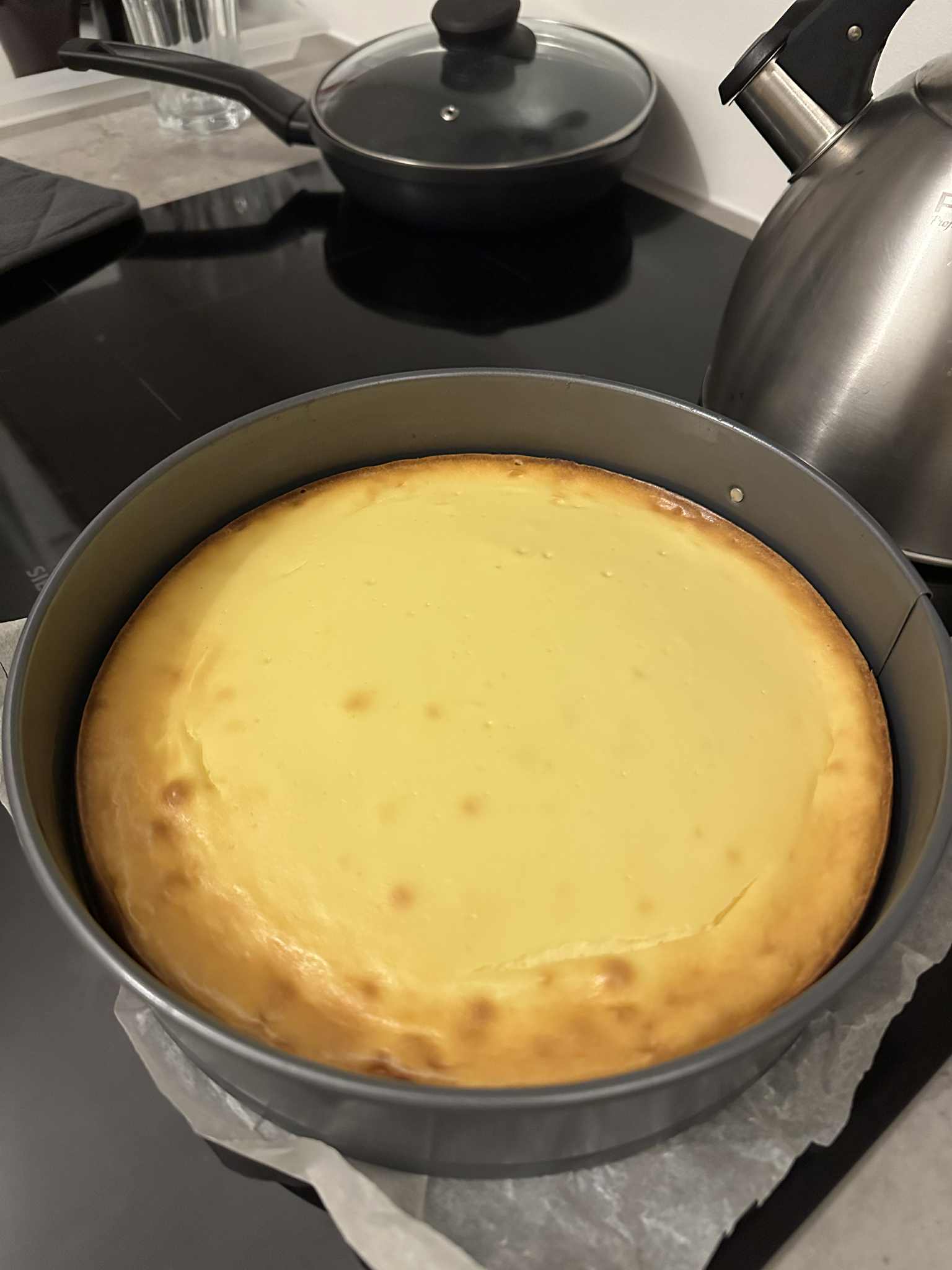 Випікайте 10 хвилин за температури 180 градусів в режимі конвекції або верхнього та нижнього нагріву. Потім зменште температуру до 120 градусів та готуйте ще 30 хвилин. Ваш сирний чизкейк має підрум’янитися зверху та трішки відходити від бортиків.