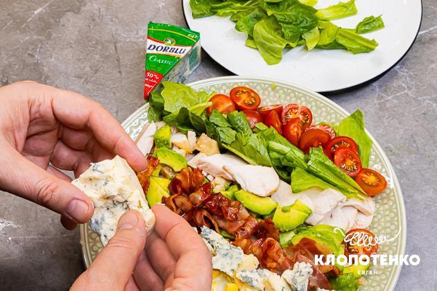 Класично кобб салат містить курку, бекон, томати, яйця, авокадо, сир і зелень. Однак ви можете експериментувати з інгредієнтами або видозмінювати їх. Так, наприклад, ми радимо замість звичайного сиру додати Dorblu Käserei Champignon – він має витриманий пікантний смак, котрий гарно поєднуватиметься з рештою інгредієнтів. Класична заправка готується на оливковій олії та гірчиці.