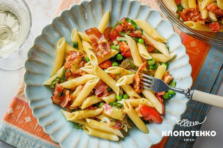 Гарячі закускиПаста пене в основі. Збалансований салат з беконом і томатами