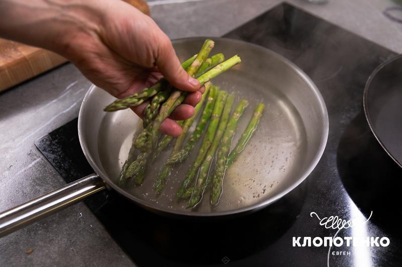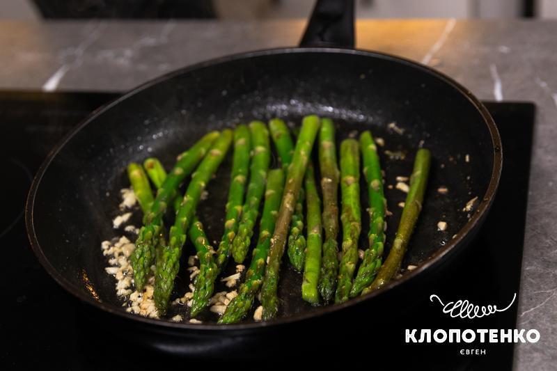На суху пательню викладіть 20 г вершкового масла. Подрібніть 2 зубчики часнику, додайте їх на пательню та зачекайте доки та нагріється. Викладіть бланшовану спаржу на сковорідку. Обсмажте спаржу 1 хвилину та викладайте на тарілку.