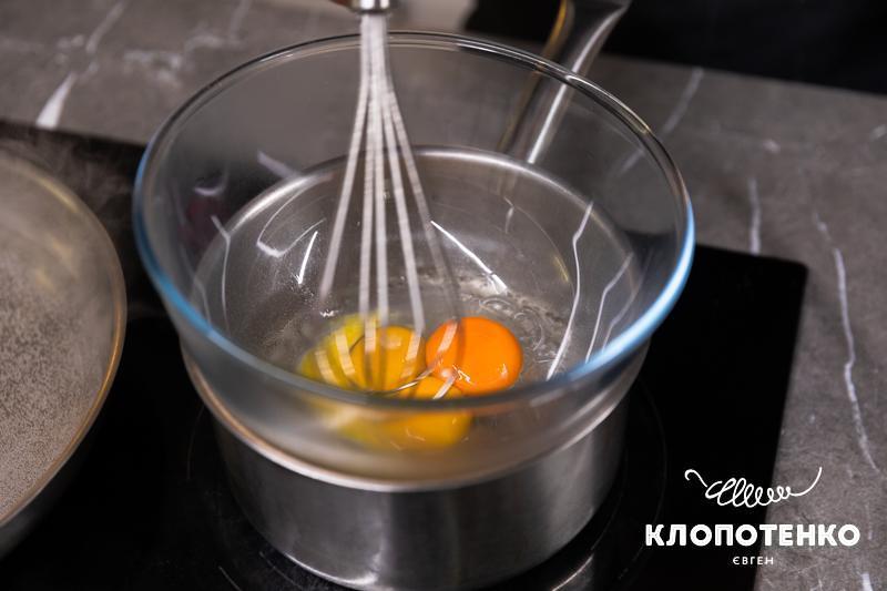 Для соусу наповніть сотейник водою на половину обʼєму та доведіть її до кипіння. Розділіть 3 яйця на жовтки і білки, жовтки покладіть у жаротривку миску та поставте на сотейник на парову баню. Додайте до жовтків 1 ч.л. води та 1 ст.л. лимонного соку, перемішайте та варіть до густої консистенції, постійно помішуючи.
