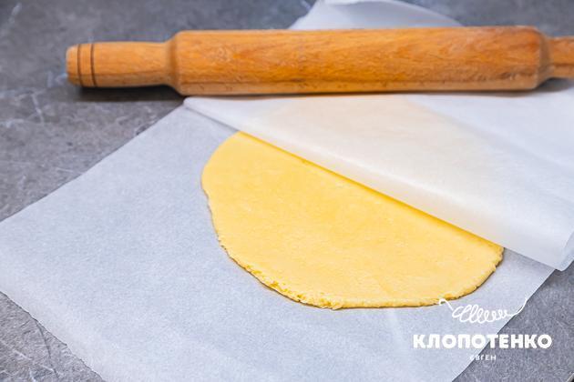 Викладіть тісто на пергаментний папір, зверху накрийте ще одним листом і розкачайте тісто товщиною приблизно 0,5 см.