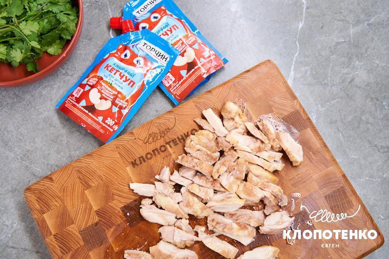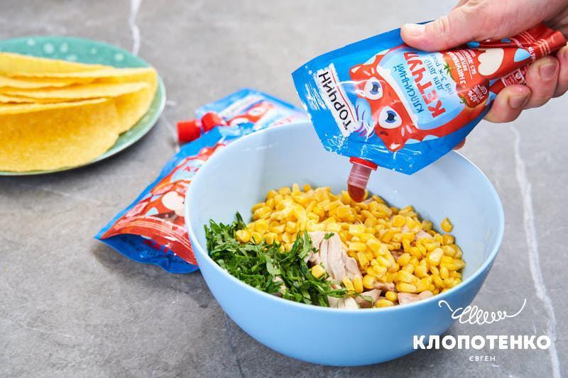 Заправте начинку 100 г кетчупу Торчин для дітей, гарно перемішайте.