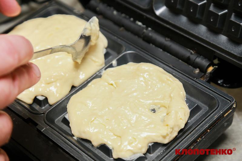 Добре розігрійте вафельницю. Викладіть на кожну сторону по 1-1,5 ст. л. тіста. Розрівняйте по всіх площині. Випікайте вафлі по 7-8 хвилин.