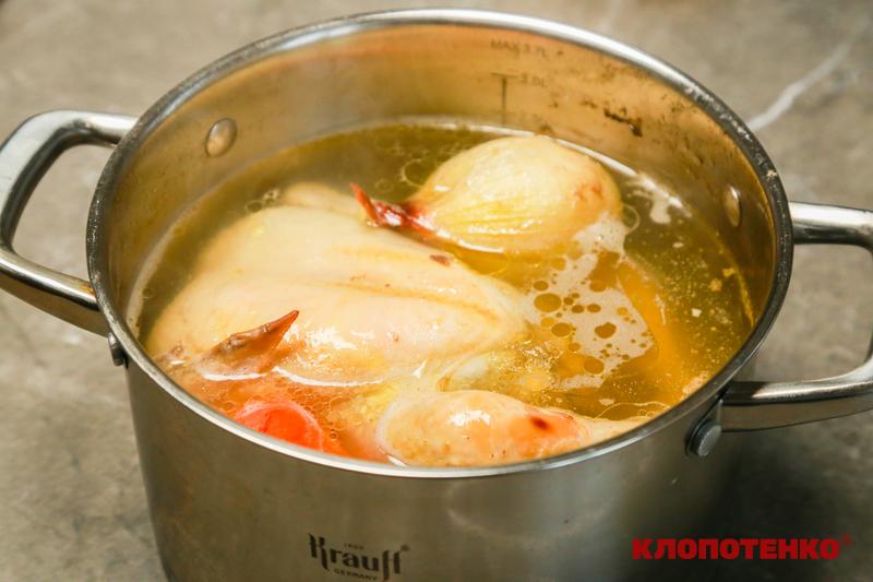 Курку ретельно помийте, викладіть у каструлю та залийте 2-3 л холодної води. Коли вода закипить, зменште вогонь та зніміть з поверхні усю піну, щоб бульйон вийшов прозорим. Овочі помийте та почистьте, додайте в бульйон до курки. Варіть бульйон 1,5 год на маленькому вогні. Коли бульйон буде готовий, вийміть з нього овочі та курку. Цибулю та селеру можна викинути — вони вже віддали свій смак, а ось курку охолодіть до кімнатної температури та розберіть на м'ясо. Якщо любите моркву, її також можна нарізати та додати в каструлю. Посоліть та поперчіть бульйон собі до смаку.