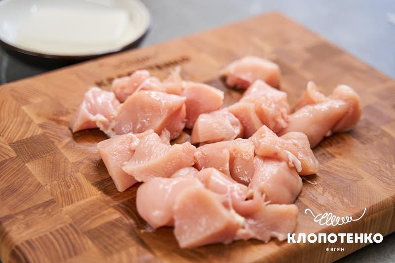 Увімкніть розігріватися духовку до 180 градусів в режимі верхнього та нижнього нагріву. Поріжте довільними шматочками 500 г курячого філе.