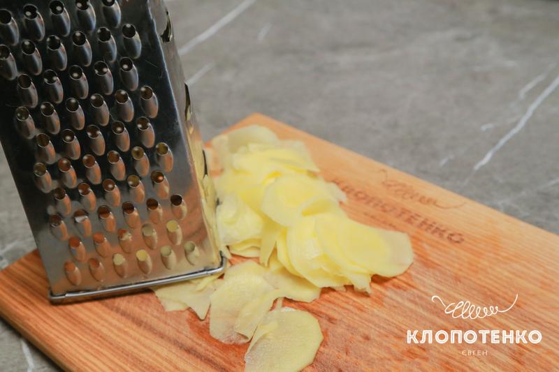 Почистіть 700 г картоплі та натріть її на велику тертку для слайсів.