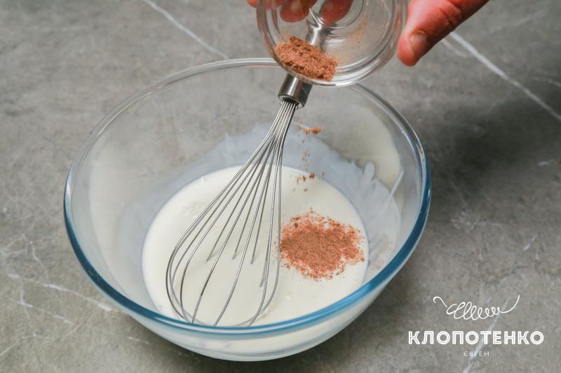 Змішайте 250 мл молока, 250 мл вершків, ⅓ ч. л. мускатного горіха та сіль до смаку.