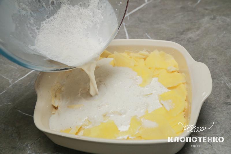 Змастіть 20 г вершкового масла прямокутну керамічну форму для випікання розміром приблизно 27х16 см. Викладіть у неї всю картоплю та 3 дрібно порізаних зубчики часнику. Залийте картоплю заливкою.