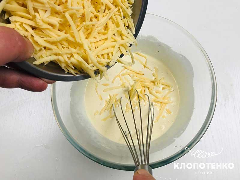Будь-який твердий сир (200 г) натріть на крупній тертці та додайте в яєчно-вершкову суміш. Перемішайте, щоб сир рівномірно розподілився в масі.
