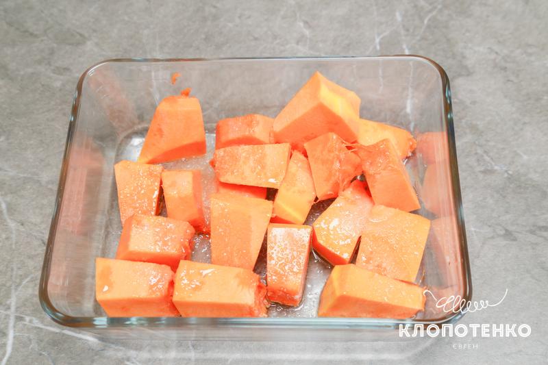 Почистіть 400 г гарбуза, поріжте на шматочки та викладіть у керамічну форму для випікання. Присипте 1 ст. л. цукру, полийте 1 ст. олії, накрийте фольгою та випікайте протягом 50-60 хвилин при 180 градусах.