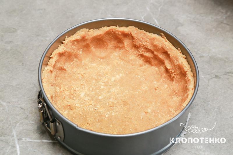 Викладіть масу з печива у розʼємну форму діаметром 20 см, застелену пергаментом, та сформуйте корж з бортами. Запечіть корж у духовці протягом 10 хвилин при 180 градусах. Далі охолодіть.