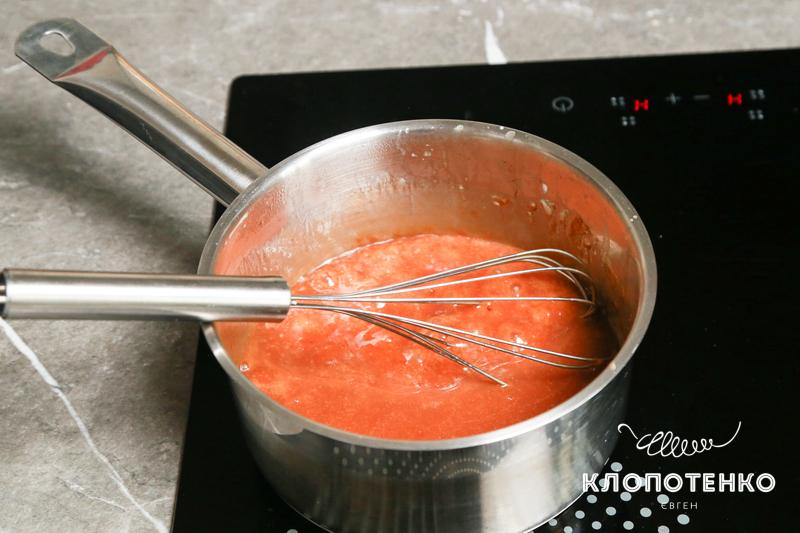 Тим часом приготуйте карамель. Для цього додайте у сотейник 200 г цукру та поставте його на вогонь. Коли він стане бурштиновим, додайте 100 масла та 180 г заздалегідь підігрітих вершків. Перемішайте та відставте карамель, щоб вона стабілізувалась.