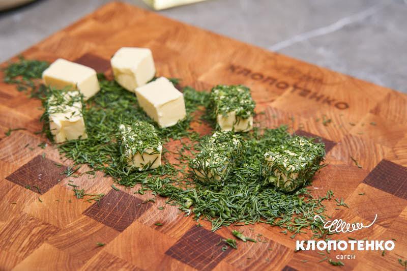 Посічіть кріп, масло розріжте на 8 однакових кубиків. Обваляйте масло в кропі.