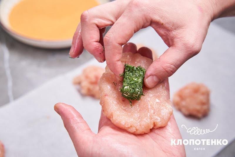 Зазвичай ці котлети мають начинку з вершкового масла та зелені. Тут ми використовуємо кріп. Однак часом у котлети кладуть також сир, гриби, яєчний жовток чи інші інгредієнти. Ви можете додати до начинки щось за своїм смаком.