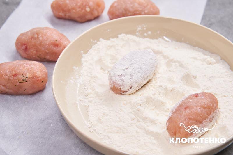 Обваляйте котлети в 50 г борошна, викладіть на дощечку та поставте в морозилку на 20 хвилин.