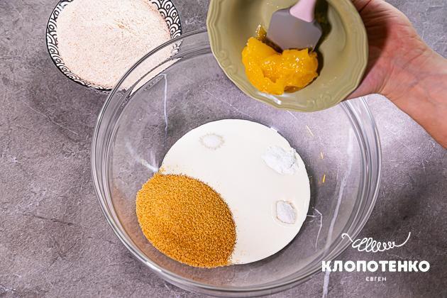 Розтопіть 100 г вершкового масла. Перелийте його у велику миску, додайте 140 мл вершків, 110 г меду, ⅓ ч.л. солі, 1 ч.л. розпушувача, 10 г ванільного цукру, 180 г тростинного цукру.