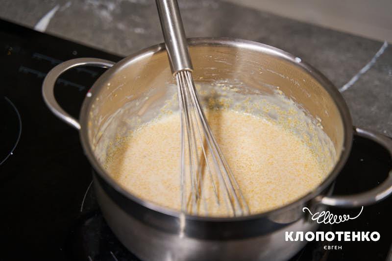 Налийте в сотейник 500 мл молока та доведіть його до кипіння. Посоліть чи поцукріть до смаку, всипте 100 г кукурудзяної крупи, постійно помішуючи.