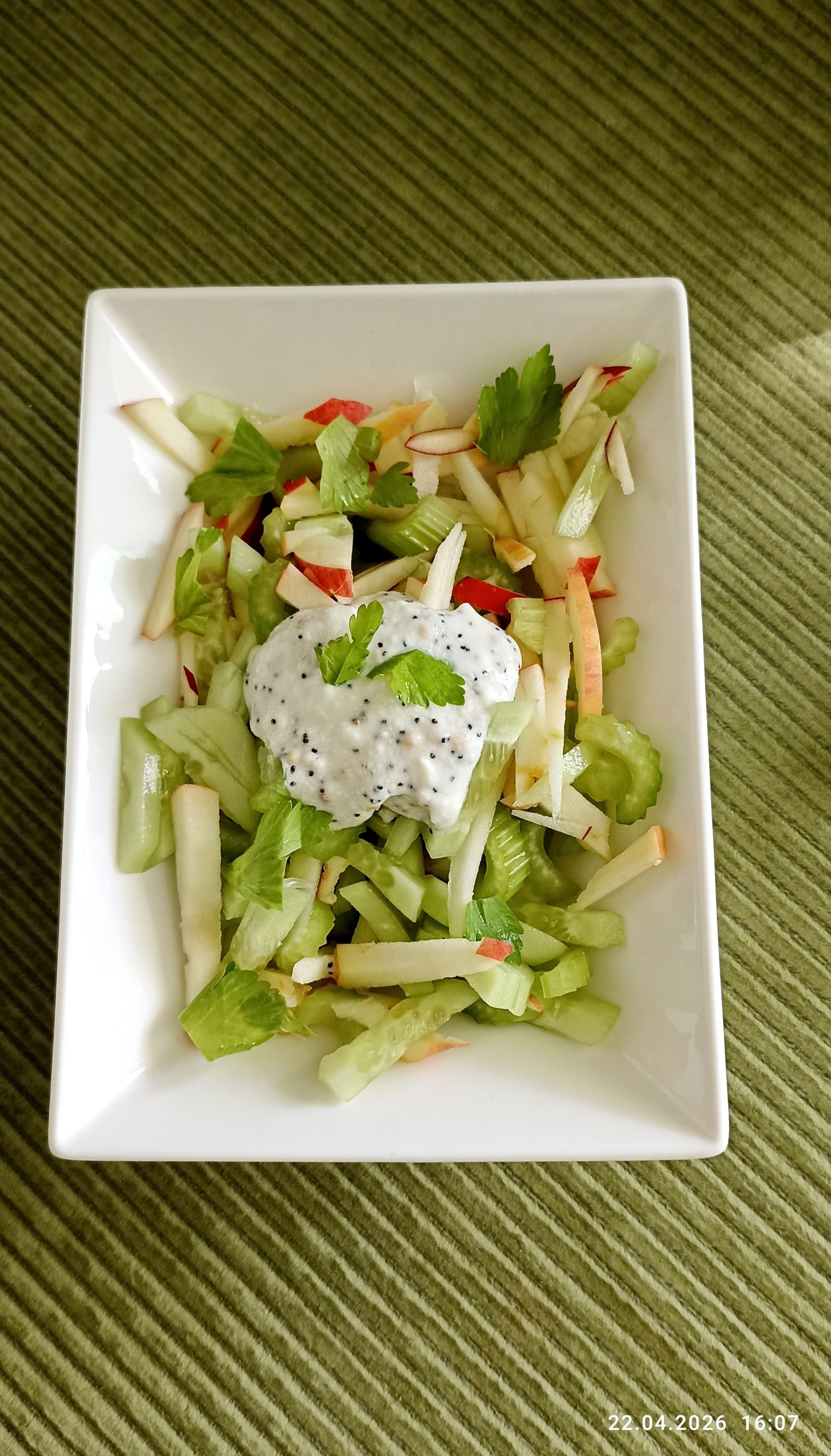У великій мисці з’єднайте селеру, яблука та огірок. Полийте салат підготовленою заправкою та обережно перемішайте.