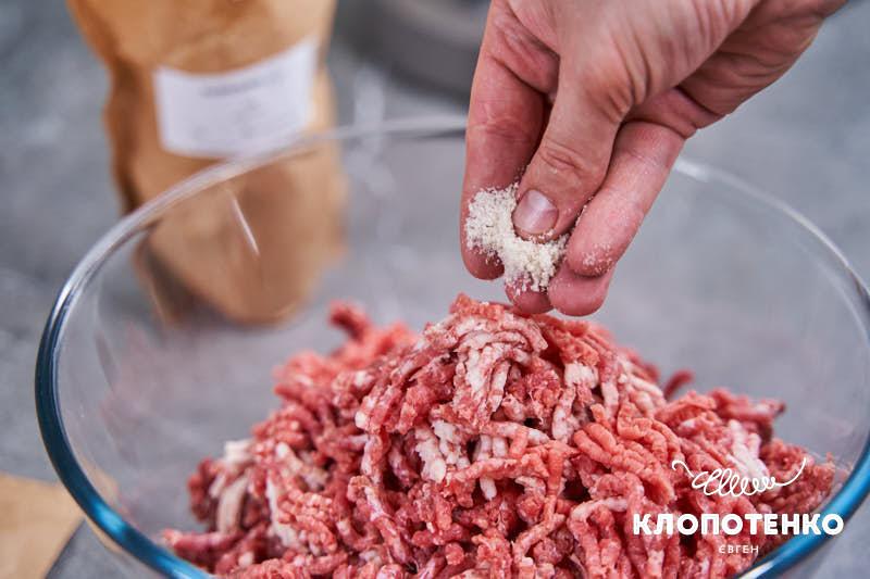 Візьміть 1 кг яловичини, приберіть зайві плівки та перекрутіть на м’ясорубці з середньою решіткою. Потім так само перекрутіть 3 зубчики часнику, цибулину та 100 г сала. Додайте 1 ч.л. з гіркою копченої солі та 1/2 ч.л. перцю.