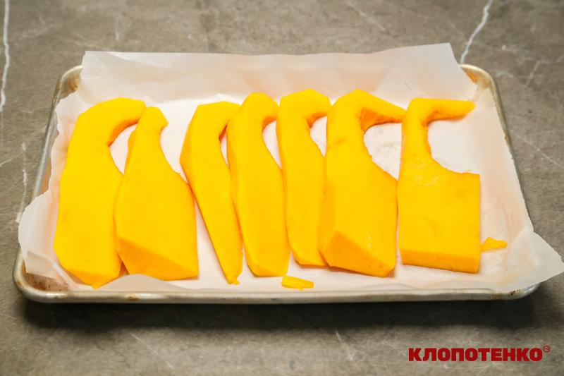 Гарбуз очистьте від шкірки та насіння і наріжте скибками. Викладіть скибки на застелене пергаментом деко і запікайте в розігрітій до 180°C духовці приблизно 30–40 хвилин або до м’якості. Готовий гарбуз охолодіть до кімнатної температури.