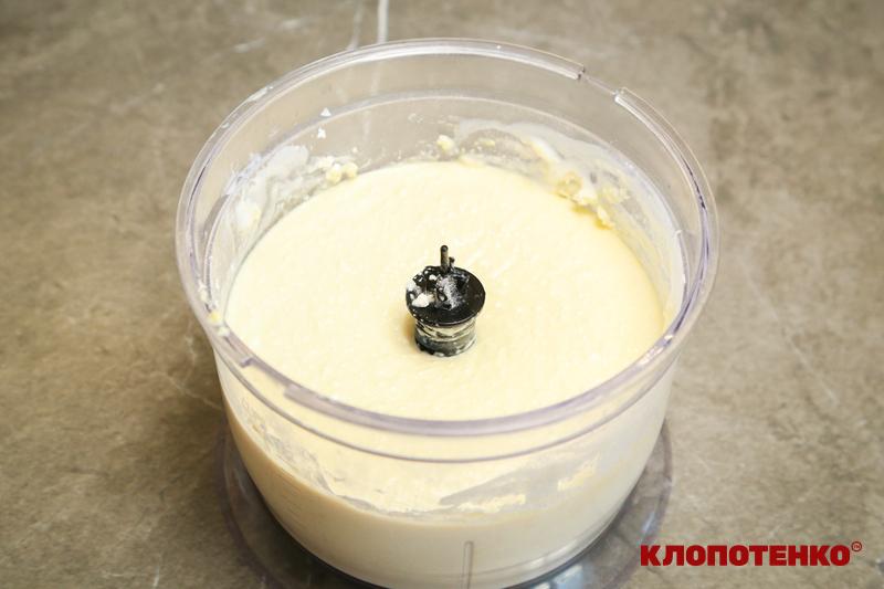 Для сирної маси: у глибокій мисці з’єднайте 600 г сиру, 3 яйця, 100 г цукру, 10 г ванільного цукру та 140 г кефіру. Ретельно перебийте масу занурювальним блендером до однорідності, щоб не залишилося грудочок. Додайте 4 ст. л. борошна з гіркою і добре перемішайте ложкою або вінчиком.