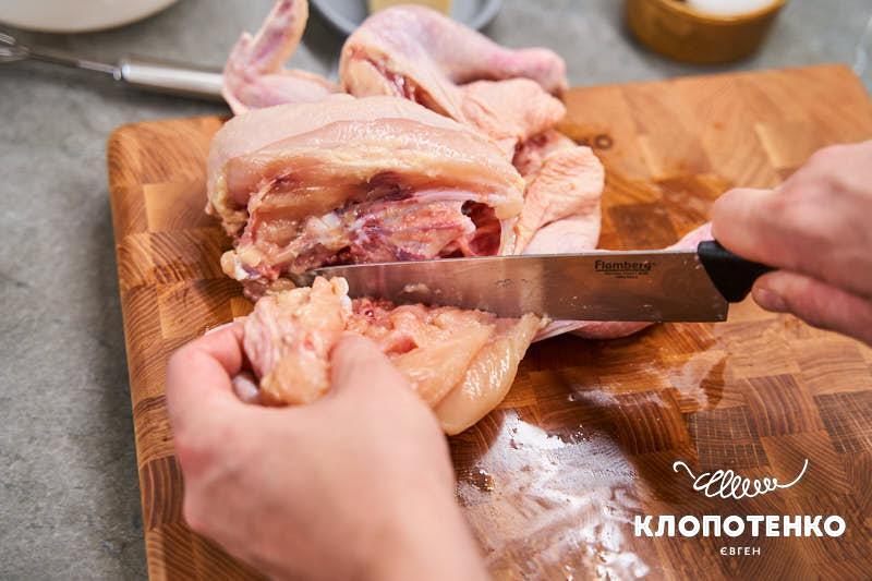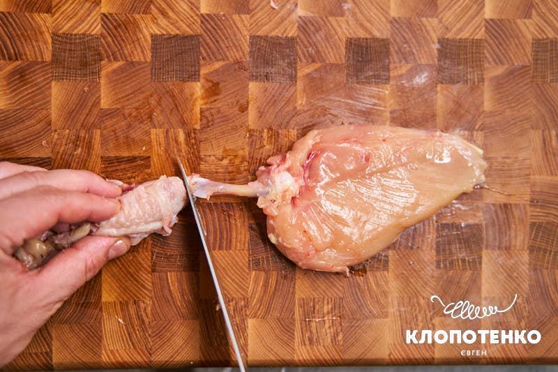 Вимийте курку, викладіть на спину та акуратно розріжте її навпіл по грудці. Зніміть шкірку і ніжно відрізайте філе з грудки від центру до крила, лишивши плечову кістку прикріпленою до шматка м’яса. Повторіть те саме з другим філе.