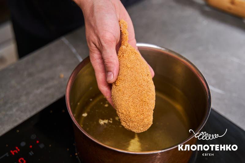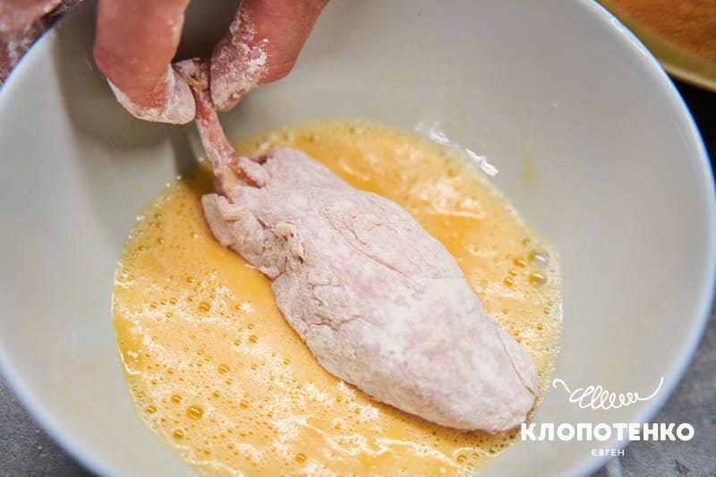 Підготуйте 3 миски для панірування: зі 100 г борошна, 2 збитими яйцями та 150 г панірувальних сухарів. Запаніруйте обидві котлети, обмочуючи по черзі в борошні, розбовтаних яйцях і сухарях. Перекладіть котлети в холодильник на 10 хвилин. Повторно запаніруйте котлети в яйці та сухарях, але вже без борошна.