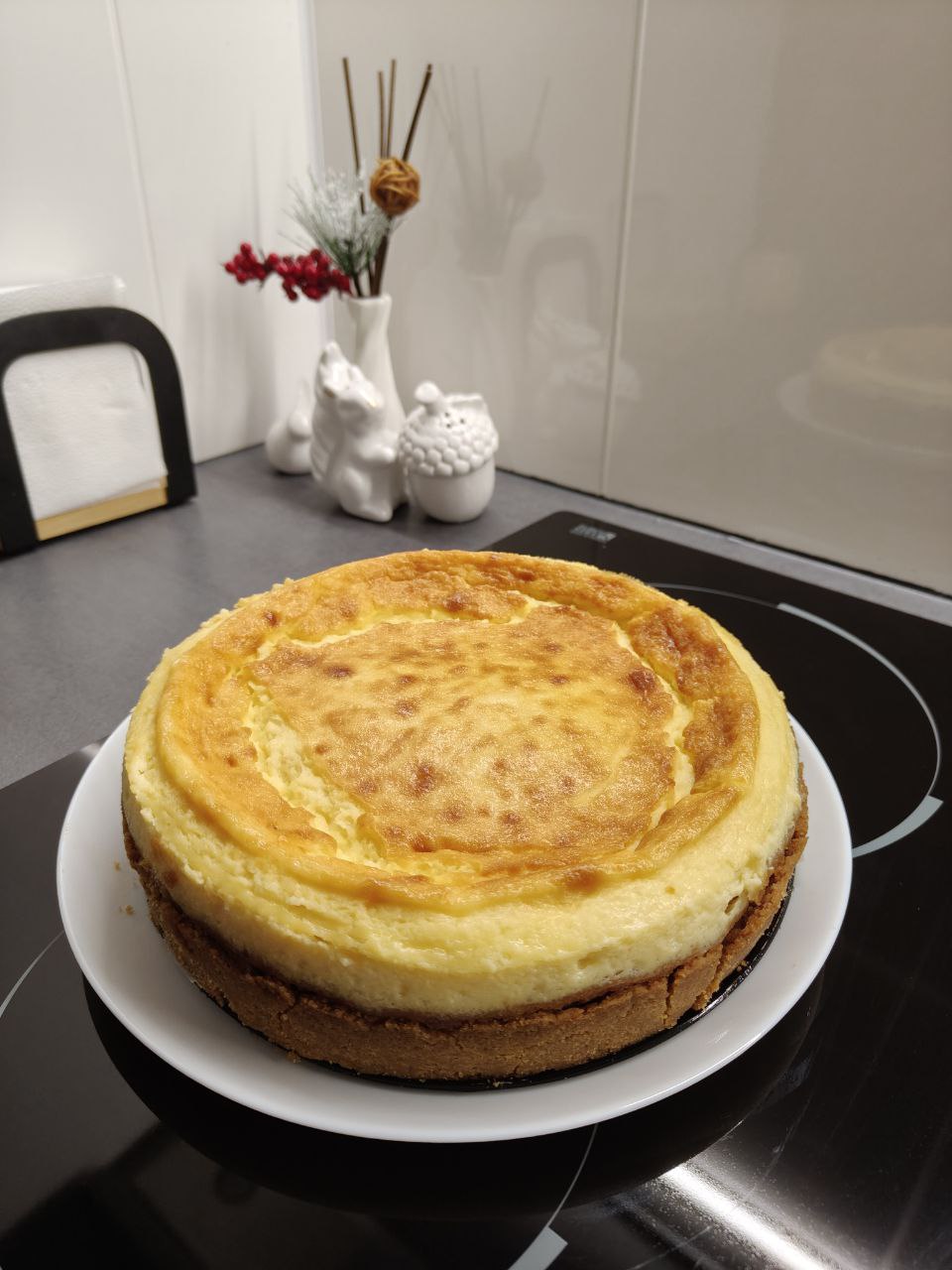 Інколи чизкейк Нью-Йорк готують в духовці, змінюючи температуру в процесі, але я надаю перевагу водяній бані. Ми поставимо форму з десертом у глибоке деко з водою, це допоможе отримати більш пухкий чизкейк, добре пропечений всередині. Основу також краще попередньо запечіть окремо, не пропускайте цей крок.