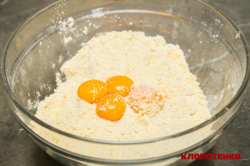 У велику миску додайте 680 г борошна, дрібку солі та 200 г м’якого масла. Ретельно розітріть масло з борошном до стану крихти. Додайте в тісто 4 жовтки та перемішайте.