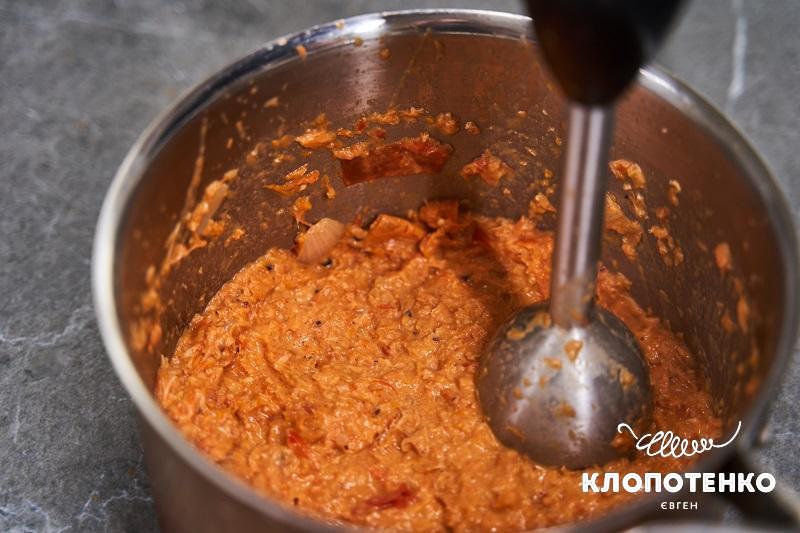Зніміть суп з вогню та перебийте всі складові блендером до максимально можливої однорідності.