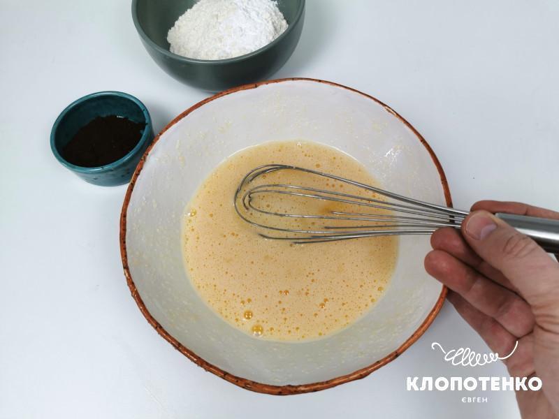 В інший посуд вбийте 3 яйця та всипте 100 г цукру. Збийте віничком. За бажанням використовуйте міксер чи кухонну машину з насадкою «Віничок». Борошно (60 г) змішайте з 5 г розпушувача.
