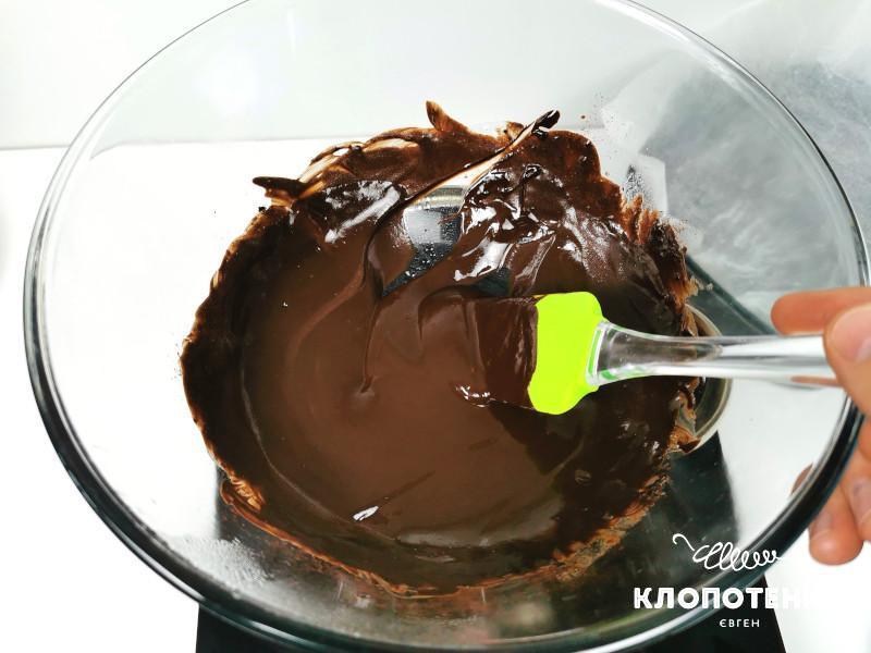 Зробіть парову баню. В посуд, що буде зверху, поламайте руками 150 г темного шоколаду не менше 73% та додайте 80 г вершкового масла жирністю 82,5%. Розтопіть, періодично помішуючи. Зніміть з парової бані та дайте охолонути 5 хвилин. Увімкніть розігріватися духовку до 180 градусів.