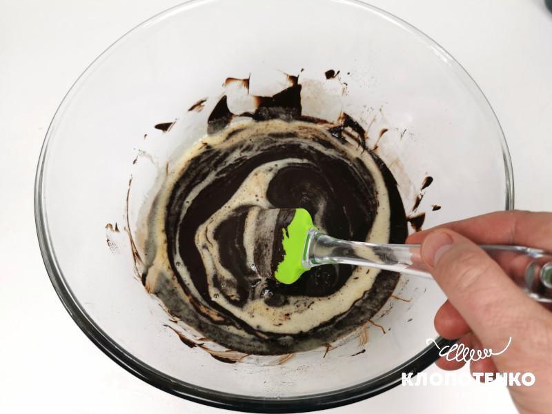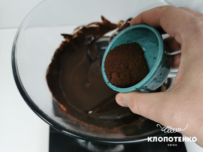 У шоколадну суміш додайте 10 г меленої кави та 10 г какао порошку. Перемішайте силіконовою лопаткою, обережно вмішуючи інгредієнти.
