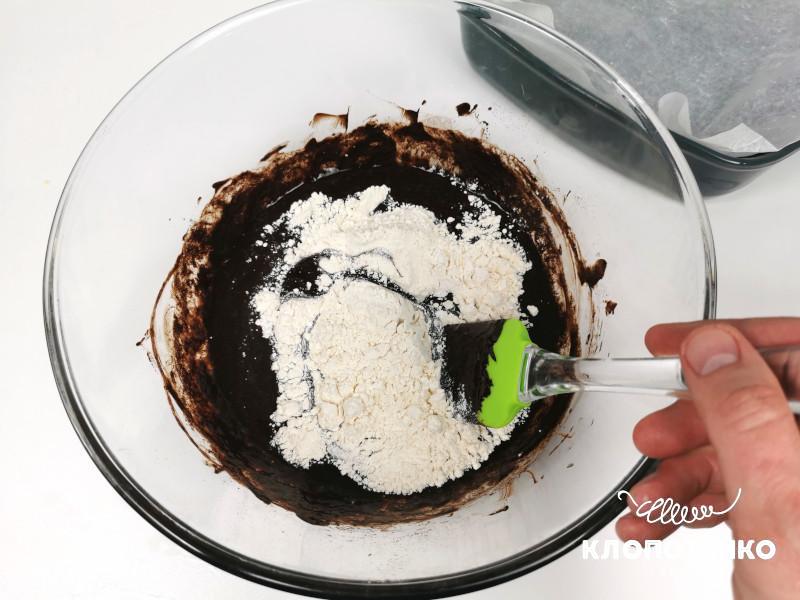 Всипте борошно з розпушувачем у миску до всіх інгредієнтів.