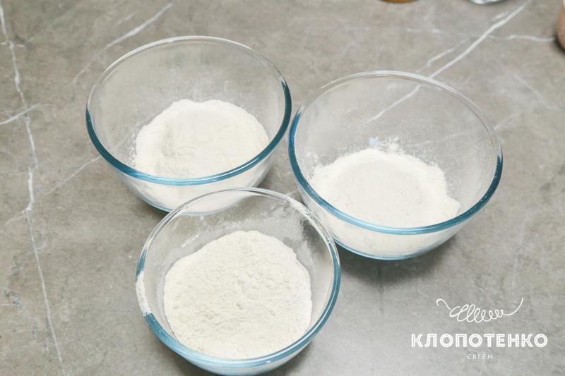 Змішайте у глибокій мисці 160 г борошна, 100 г цукру, 150 г манки, 10 г ванільного цукру та 10 г розпушувача. Розділіть отриману суху масу на 3 рівних частини.