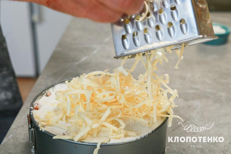 Повторіть прошарок борошняної суміші та яблучної начинки. Добре утрамбуйте яблука та присипте сумішшю. Зверху натріть 100 г холодного масла.
