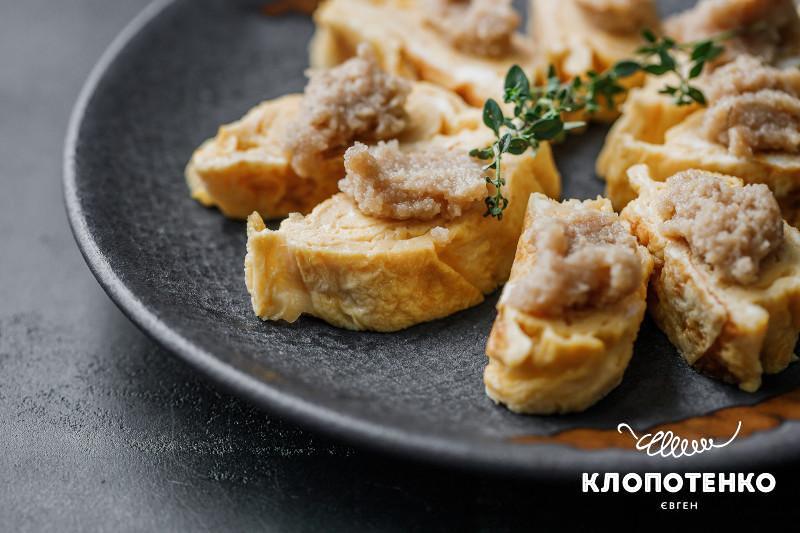 Солодкуватий, багатошаровий та трохи пікантний рулет з яєць – вимагає трішки більше майстерності, ніж французький. Але теж нічого надто складного. Просто треба посмажити декілька тонких омлетних «млинців» і загорнути всі в один рулет, який потім порізати на шматочки. На них ми поклали ікру минтая, а ви можете вибрати щось інше на свій розсуд. Але ікра у японському омлеті тамагоякі – таки чудовий вибір.