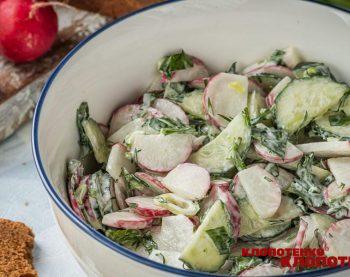 Починаємо добірку з класичного поєднання, а саме салату з редискою та огірком. Доповнюємо овочевий тандем зеленою цибулею та зеленню, а заправляємо сметаною. За бажанням салат можна заправити домашнім майонезом або звичайним грецьким йогуртом. Виходить проста, але смачна страва на щодень, що ідеально смакуватиме з картоплею чи будь-яким іншим гарніром.