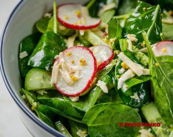 Звичайний салат з редискою та огірком можна вдосконалити, додавши до нього всього лиш декілька простих інгредієнтів. До прикладу, взяти трохи бейбі шпинату та твердий сир. Для заправки вдало підійде запашна олія у поєднанні з винним оцтом та гірчицею. В результаті отримуємо більш поживну страву з цікавим збалансованим смаком та різними текстурами.