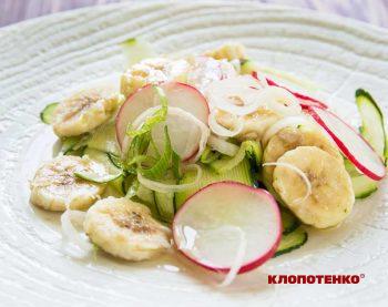 Якщо ви любите кулінарні виклики, салат з редискою і бананом точно вам сподобається. У складі також маємо цукіні та цибулю порей, що у поєднанні створює пікантно-солодку весняну композицію для гурманів. Заправка проста — це оливкова олія та лимонний сік, який ще більше підкреслює смаки кожного інгредієнта. Обовʼязково приготуйте цю страву до свята.